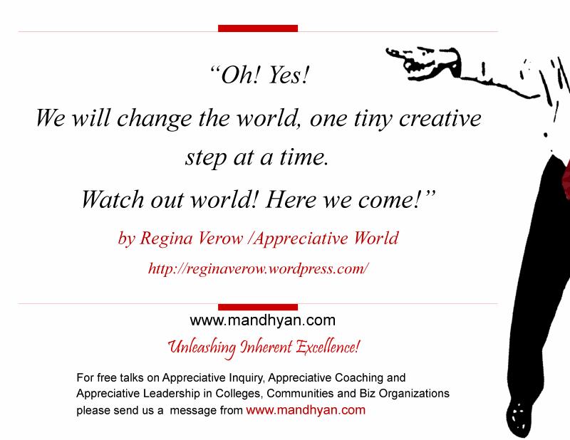 The miraculous thing about the whole process was that since the dialogues and discussions were held following the Appreciative Inquiry way of life, the fringe benefits and the by product was increased engagement at all levels of the organization. It may not show on the company’s scorecards yet but the energy levels, the open discussions in the hallways and even the number of hi-five’s seemed to have gone up.