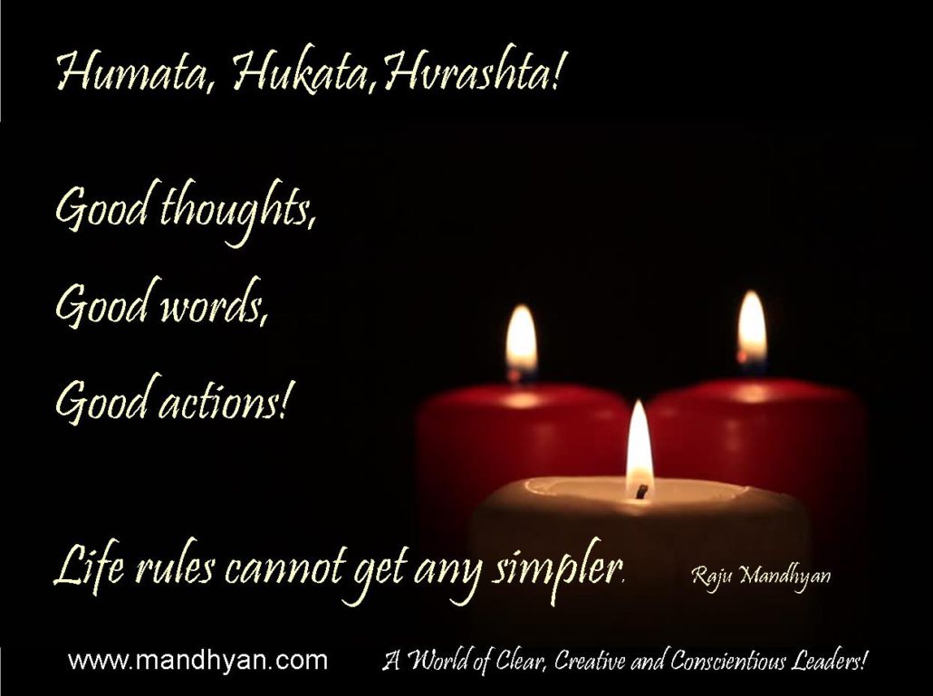 I was in my pre-teens and like most of the boys in school, I assumed it meant we must do away with foul language and vulgarity in our daily conversations and interactions. Not until I reached my 20s did I go back and ponder upon the depths, the simplicity and the precision of the philosophy embedded in those two words – Humata, Hukata.  Upon further research today, I learned that there is a third and more powerful word to complete that immortal affirmation phrase. That word is Hvrashta and the full motto is